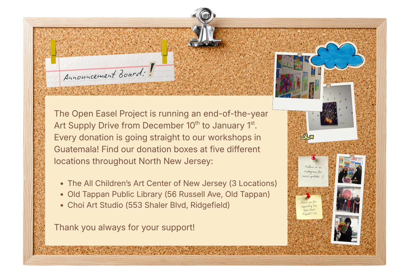 The Open Easel Project celebrated its inaugural gallery, "Art Made by Young Hearts," at Choi Art Studio in Ridgefield, New Jersey. The exhibition successfully showcased diverse artworks, including pieces made by children from the Jutiapa, Guatemala workshops and original art by President and Founder, Olivia Kim. The opening night saw a wonderful turnout of supporters who generously provided donations while enjoying a vibrant atmosphere with food and sweets. This event was a major milestone, bringing together the whole Open Easel family and providing vital support for the project's future endeavors.